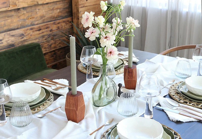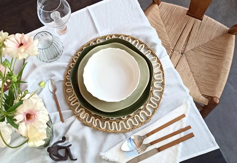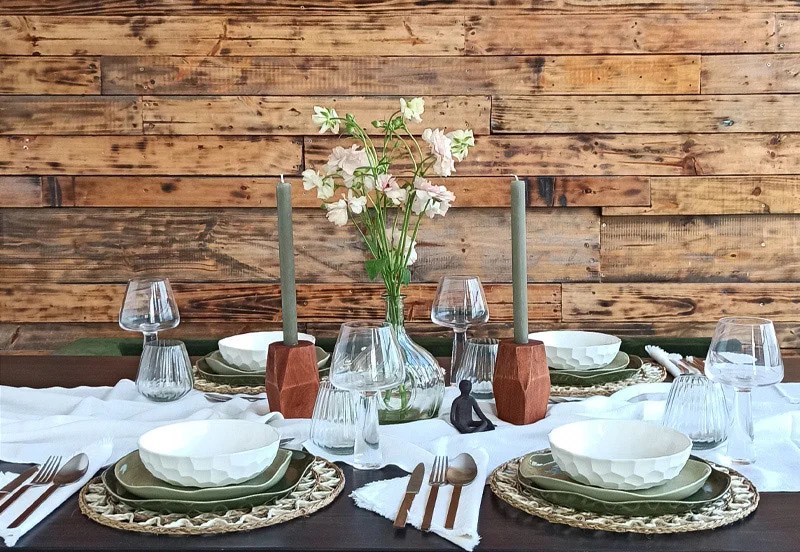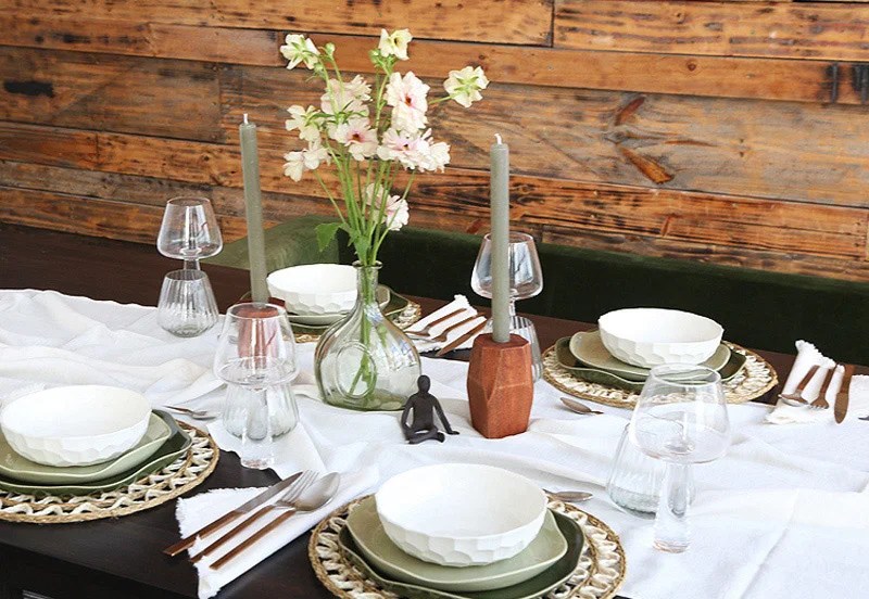 Bring the outdoors in with our nature-inspired table setting. Organic edged dinnerware is complimented with copper handle flatware, linen table runner and napkins, contoured glassware and African hardwood candleholders. Gentle and effortless style.