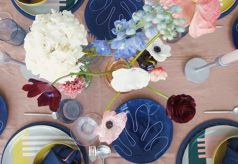 Modern and optimistic, with more than a hint of Memphis Design, this tablescape inspires creativity and conversation. Geometric shapes are softened with a hint of Matisse-style and grounded in Atlantic Blue. A colour palette for a full dopamine hit!
